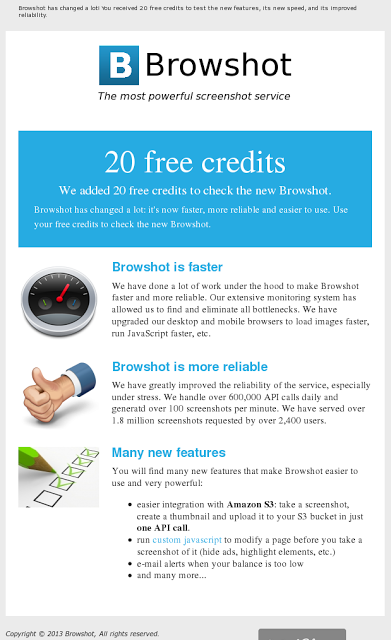We sent our first newsletter to about 230 of users who opted in and have not used Browshot in a couple of months. We wanted to let them know much Browshot has evolved recently: faster, better reliability and many new great features such as the tight integration with S3.